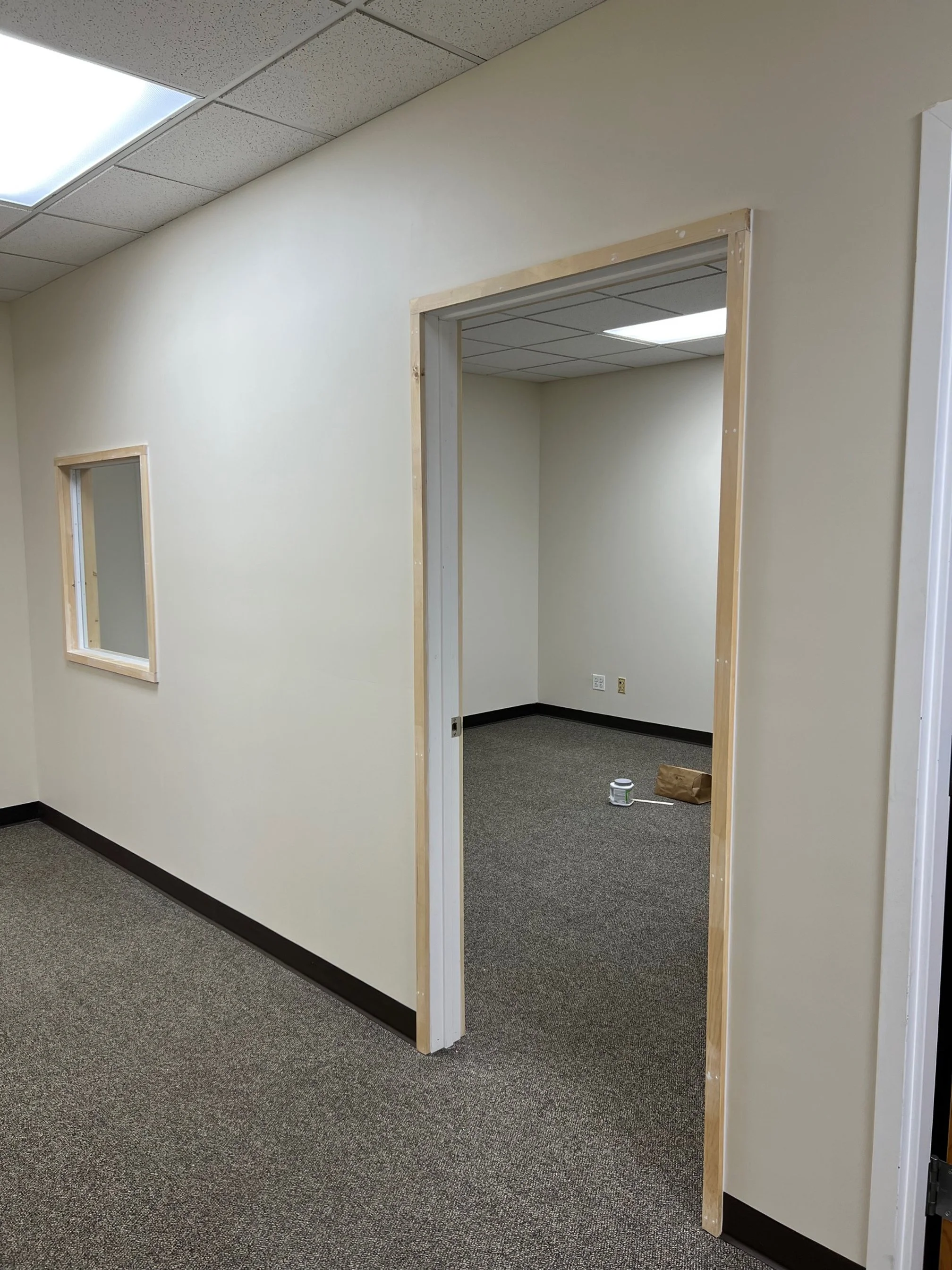 This office space needed a wall put up to make another usable room. We framed out with metal studs, added a door and a nice fixed glass window for some light and view out to the front entrance. Finished off after painting was complete with matching rubber cove baseboard